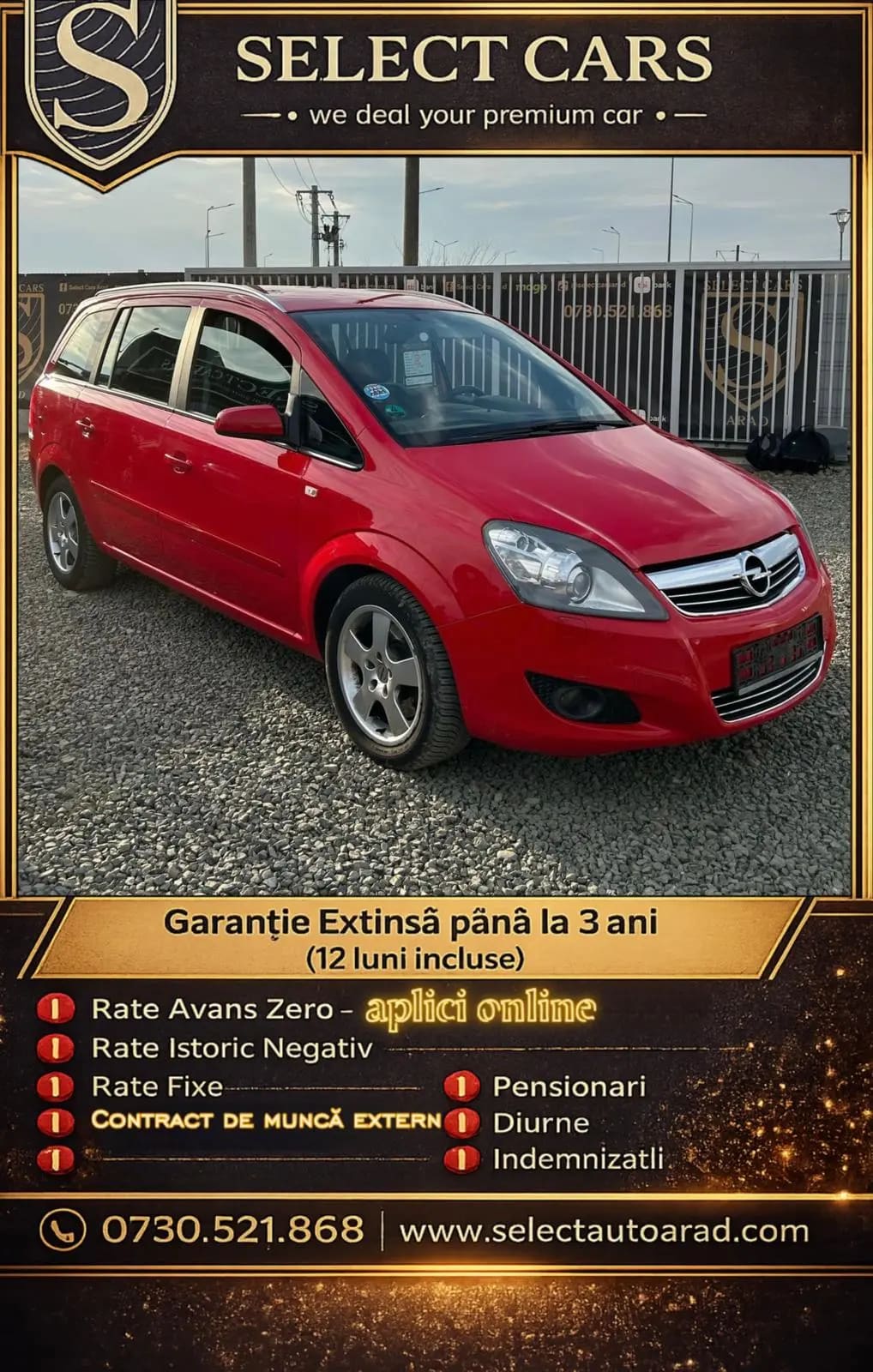 🥇La Select Cars Arad,oferim o GARANȚIE EXTINSĂ până la 3 ani,fără limita de km,la fiecare autoturism achiziționat din parcul nostru. Pe langă mai oferim: ❗️Numere Roșii GRATUITE pe o perioadă de 3 luni ❗️Verificare video de la distanță ❗️Mașini verificate cu istoric de service ❗️Rate Avans Zero-aplici din confortul casei ❗️Rate Istoric Negativ ❗️Rate Fixe ❗️Salariați străinătate ❗️Pensionari ❗️Diurne ❗️Indemnizații ❗️Buy-Back(anumite condiții) ❗️Asistență documente,inclusiv asigurare(la cerere) ❗️Garanție Extinsă până la 3 ani (12 luni inclusă) Opel Zafira din 2008 cu motorizare de 1.7 diesel si 110 CP, un rulaj de 235.000 KM, manuala in 5 trepte. Ca dotari elementare: -volan multim=functional -pilot automat -faruri automate -aux -conectivitate media -Geamuri electrice -configuratie 7 locuri -clima -carlig de remorcare 📲Vizualizează întreg stocul nostru,unde găsești peste 50 de oferte,accesând link-ul din secțiunea de comentarii✅ 📲🤝Rezervă mașina mult dorită✅Gamă variată de autoturisme ce pot fii finanțate online✅ Descopera o parte din stocul nostru 📲Pentru mai multe informatii,apel sau mesaj - 0730.521.868 si va stam la dispozitie cu orice informatie! #corectitudine #transparenta ‼️Dorești o mașină de calitate? Intră la noi pe site,pentru a viziona peste 50 de oferte la CELE MAI BUNE PREȚURI❗Verificate și testate,cu istoric de service/mentenanta efectuata,anvelope noi conform sezon si ❗incepand de la 1 August 2025,transport GRATUIT in limita a 300 km(fata de sediu)/diferenta contra-cost/numere rosii gratuite❗ ✅Ne gasiți în județul Arad,localitatea Vladimirescu,strada Iulia 2E-0730.521.868. 📲Program:Luni-Vineri:10.00-18.00 si Sămbăta:11.00-15.00